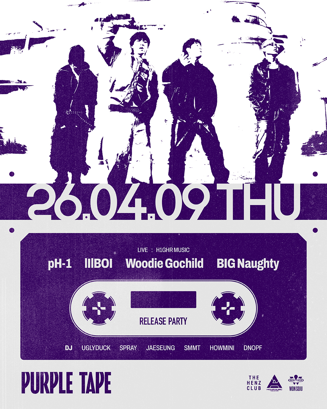 pH-1, 릴보이, 우디 고차일드, 빅나티는 9일 오후 6시 각종 온라인 음원 사이트를 통해 컴필레이션 앨범 'PURPLE TAPE'를 발매한다. 이어 같은 날 오후 10시 서울 마포구 홍대 더 헨즈 클럽(THE HENZ CLUB)에서 'PURPLE TAPE' 발매 기념 오프라인 이벤트인 릴리즈 파티를 열고 팬들과 만난다.