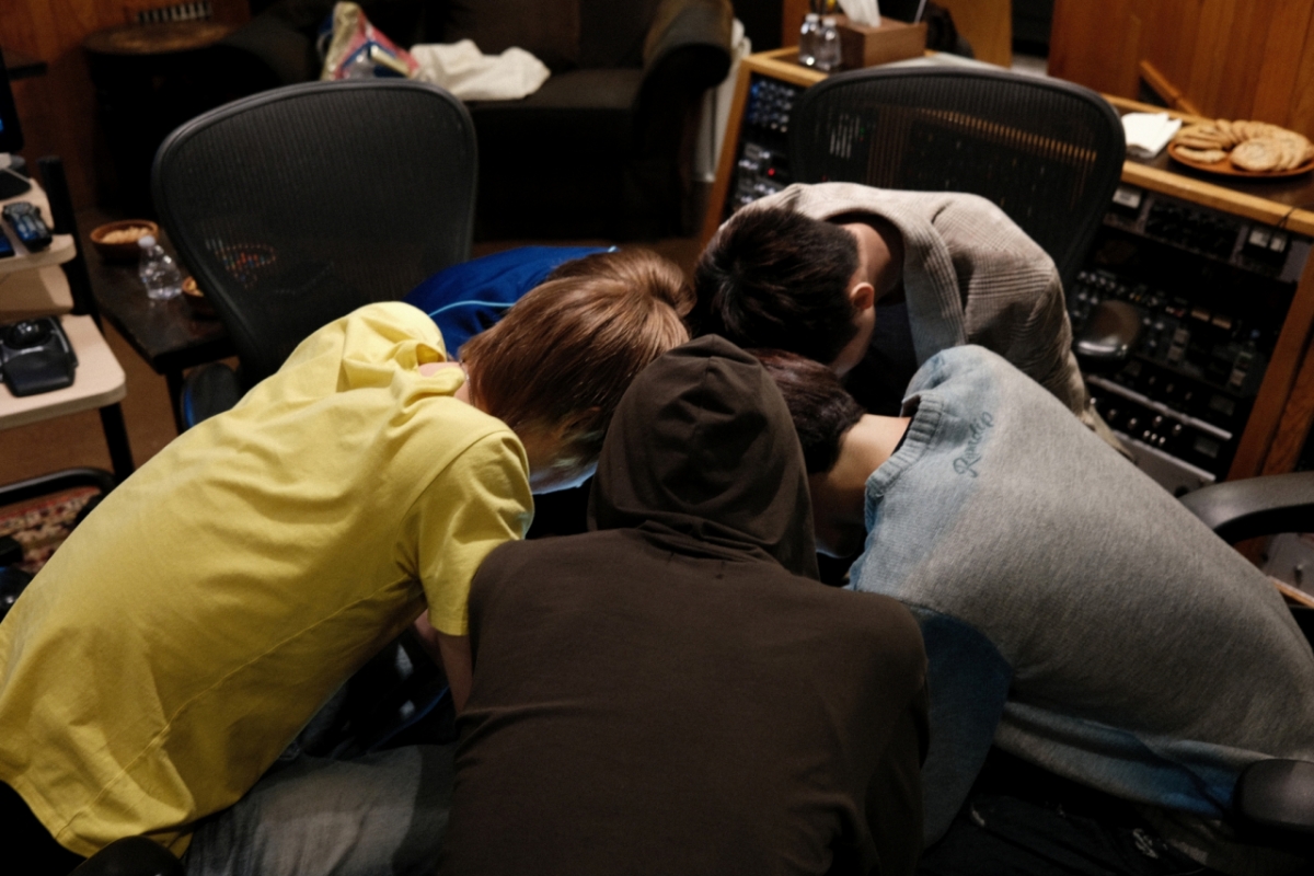 이곳에서 진지하게 음악에 몰두하거나 장난치는 순간들이 자연스럽게 포착됐다. 마틴은 헤드폰을 낀 채 모니터를 바라보고 있고, 제임스는 책상 앞에 앉아 샌드위치를 먹다가 카메라와 눈이 마주쳤다. 코앞에 들이민 렌즈를 말갛게 응시하는 주훈, 초점이 어긋났는데도 플래시 앞에서 또렷한 분위기를 내는 성현도 인상적이다. 건호는 상의를 장난스레 머리에 걸친 채 천진한 미소를 짓고 있다. 모두 화장기 없는 맨얼굴에 티셔츠, 스웨터, 재킷 등 제각기 편안한 사복 차림이다.