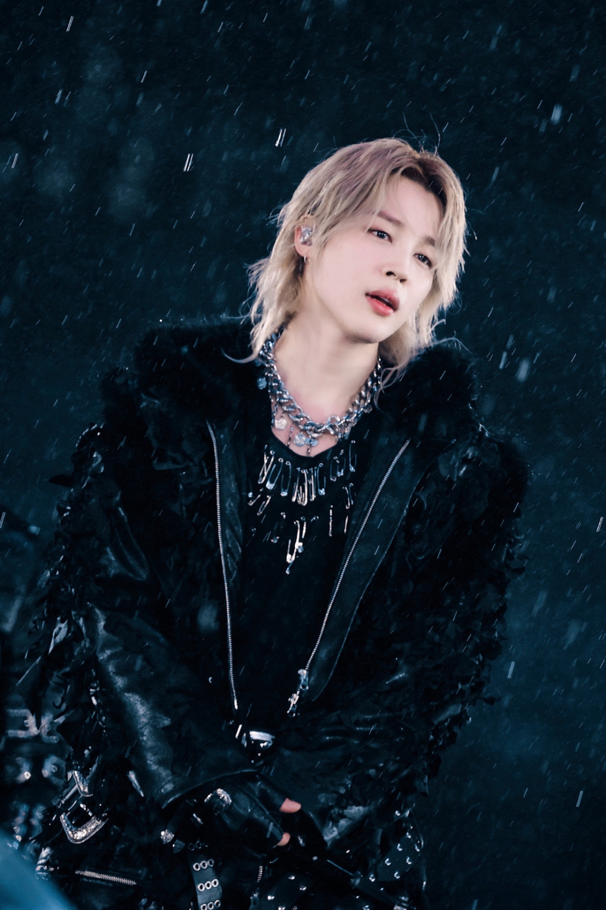 광화문 공연에서 화제를 모았던 지민의 긴 금발은 이날 비에 젖어 한층 더 신비로운 분위기를 자아냈다. 특히 물기를 머금은 채 얼굴선을 따라 흐르는 젖은 머리카락과 블랙 레더 스타일링의 판타지적 무드로 '북부 대공'이라는 닉네임까지 만들어냈다.