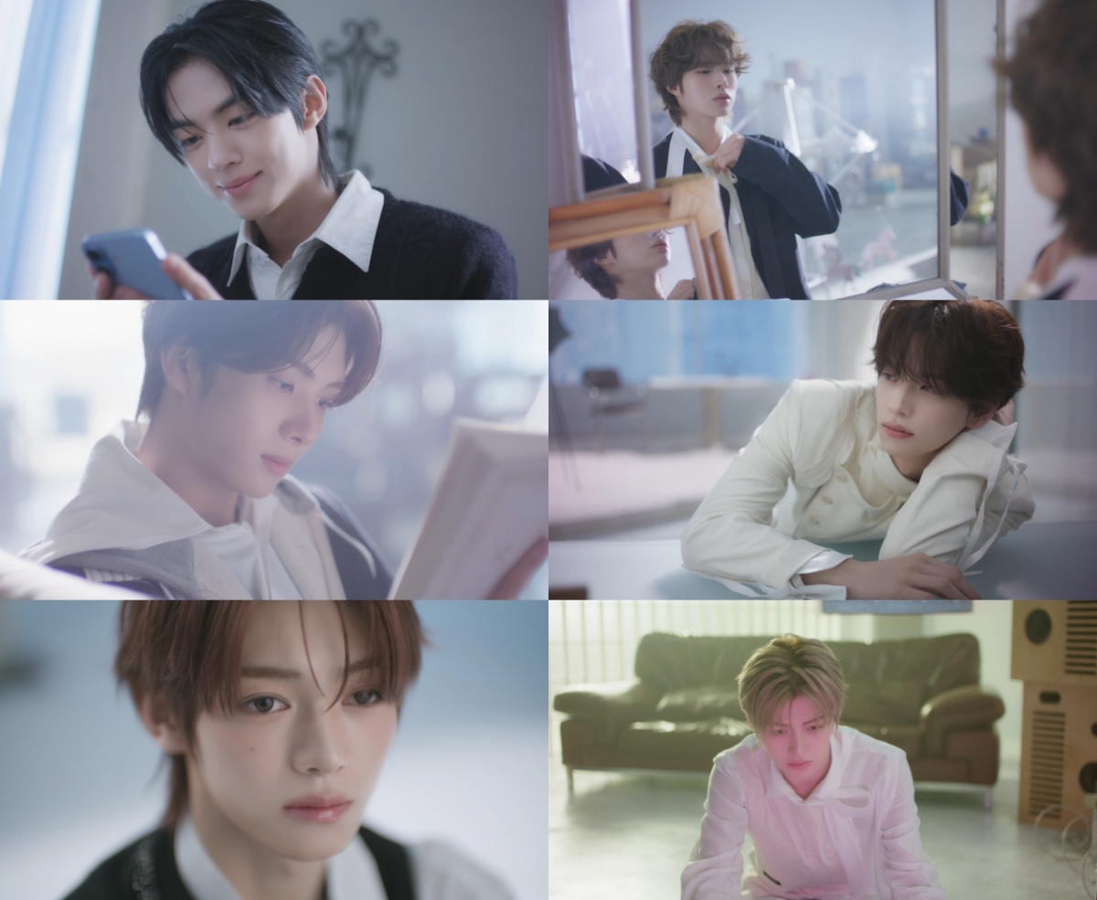 사랑에 빠진 TWS의 벅찬 마음이 화면 가득 비친다. 문자 메시지로 전해진 "네가 너무 좋아"라는 고백에 환하게 미소 짓는 도훈, 누군가를 위해 정성껏 선물을 포장하고 그 순간을 기록하는 경민의 모습이 풋풋한 설렘을 자아낸다. '로미오와 줄리엣'을 읽으며 'star-cross'd lovers'라는 글귀를 손으로 짚어내는 영재에게서는 마치 다가올 폭풍전야와 같은 고요한 아름다움이 느껴진다.