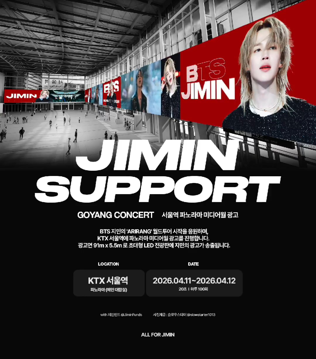 콘서트가 열리는 11일과 12일 이틀간, KTX 서울역의 메인대합실에 위치한 파노라마 미디어월에서 지민을 응원하는 광고 영상이 송출될 예정이다.