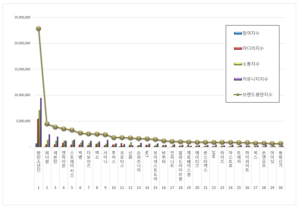 2026년 4월 보이그룹 브랜드평판 30위 순위는 방탄소년단, 워너원, 세븐틴, 엔하이픈, 스트레이 키즈, 빅뱅, 더보이즈, 엑소, 샤이니, 투어스, 코르티스, 신화, 슈퍼주니어, NCT, 보이넥스트도어, 비투비, 인피니트, 알파드라이브원, 제로베이스원, 에이티즈, 몬스타엑스, 2PM, 라이즈, 아스트로, 트레저, 하이라이트, 빅스, 온앤오프, 아이딧, 동방신기 순으로 분석됐다.