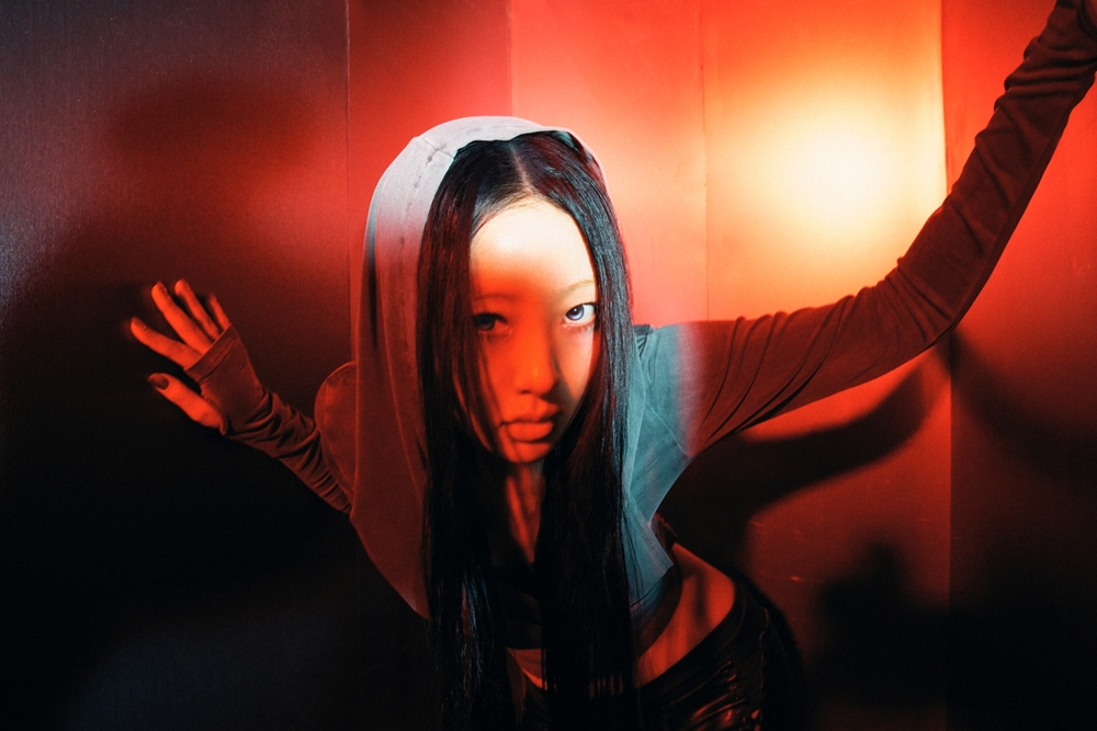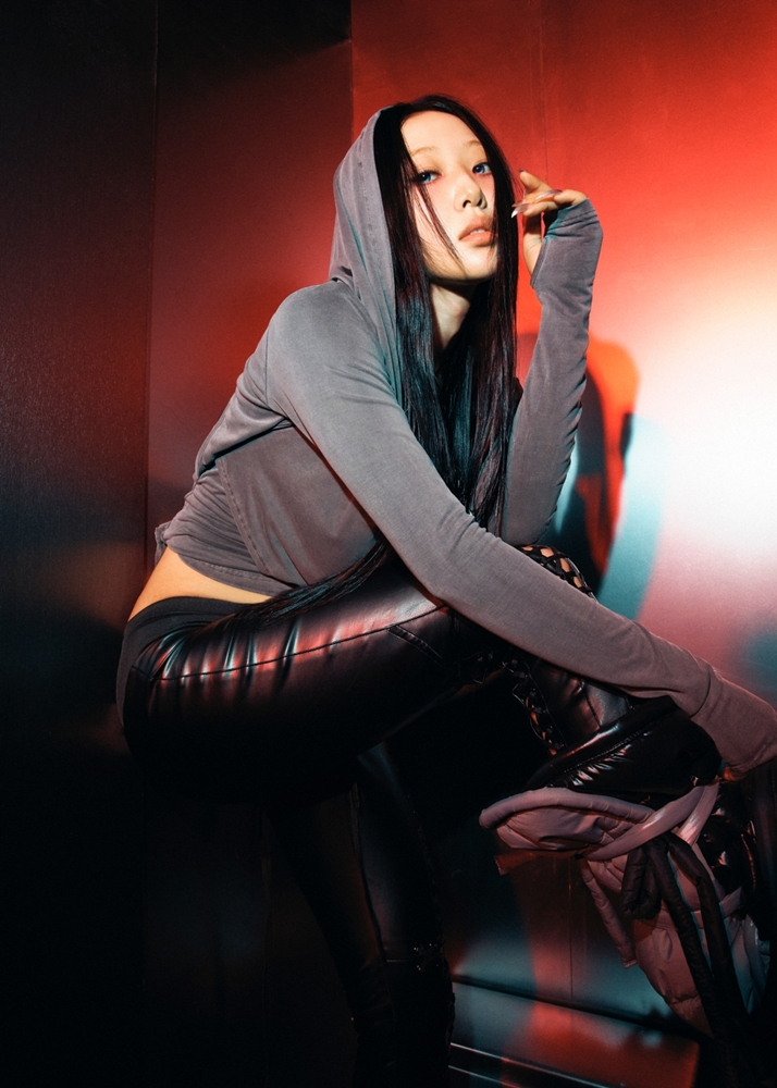 사진 속 이브는 강렬한 레드 톤 조명이 내리쬐는 공간에서 역동적인 포즈를 취하고 있다. 이브는 매혹적인 눈맞춤과 함께 독보적인 존재감을 뽐내 눈길을 끌었다.