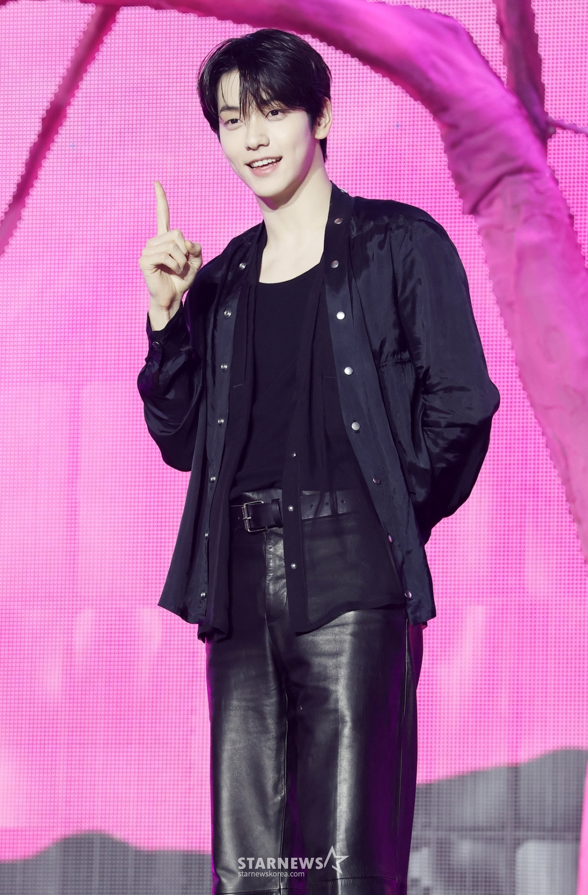 그룹 투모로우바이투게더 수빈이 13일 서울 성북구 고려대학교 화정체육관에서 진행된 미니 8집 '7TH YEAR: 가시덤불에 잠시 바람이 멈췄을 때' 발매 기념 쇼케이스에서 포즈를 취하고 있다. /2026.04.13