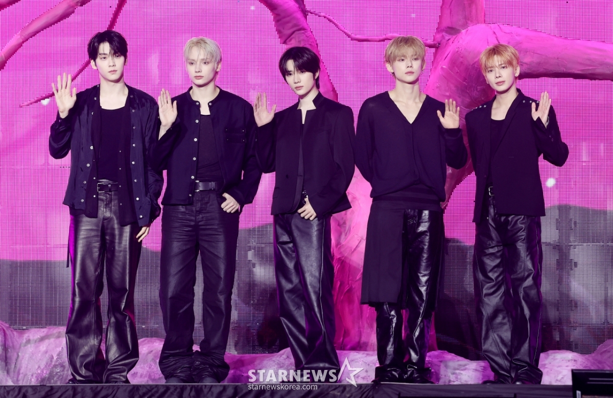 그룹 투모로우바이투게더가 13일 서울 성북구 고려대학교 화정체육관에서 진행된 미니 8집 '7TH YEAR: 가시덤불에 잠시 바람이 멈췄을 때' 발매 기념 쇼케이스에서 포즈를 취하고 있다. /2026.04.13
