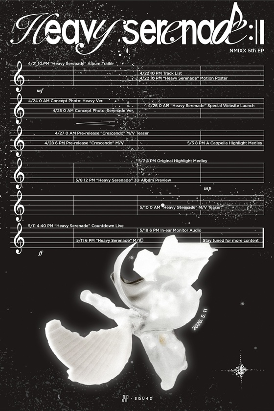 이번 스케줄러 이미지는 '헤비 세레나데'라는 앨범명처럼 오선보와 높은음자리표, 음표, 악상기호 등이 그려져 낭만적인 분위기를 자랑한다. 이에 따르면 엔믹스는 4월 21일 앨범 트레일러를 시작으로 22일 트랙 리스트와 모션 포스터, 24일~25일 콘셉트 포토, 26일 스페셜 웹사이트, 5월 3일 아카펠라 하이라이트 메들리, 7일 오리지널 하이라이트 메들리, 8일 3D 앨범 프리뷰를 차례로 오픈한다.