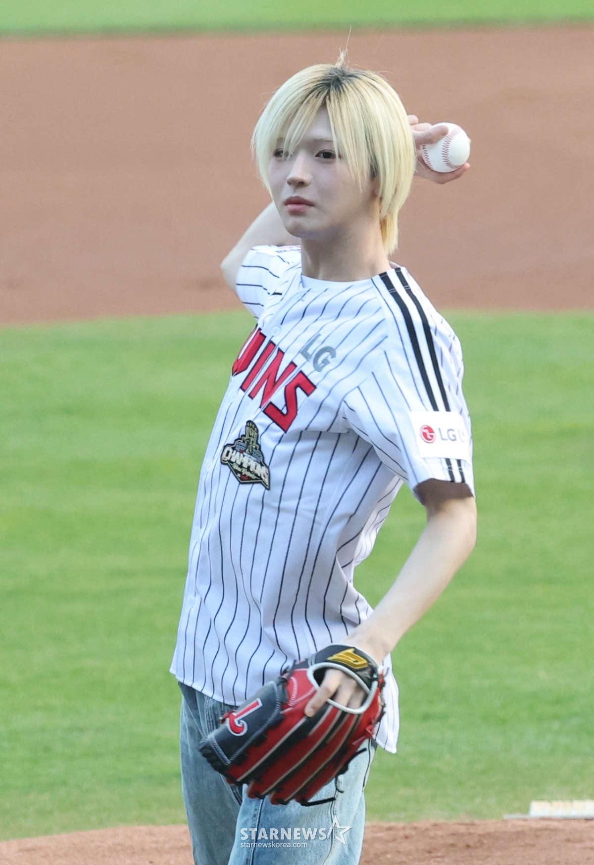 그룹 아이덴티티(idntt) 멤버 이청명이 LG 승리기원 시구를 하고 있다. 시타는 멤버 최태인이 맡았다.