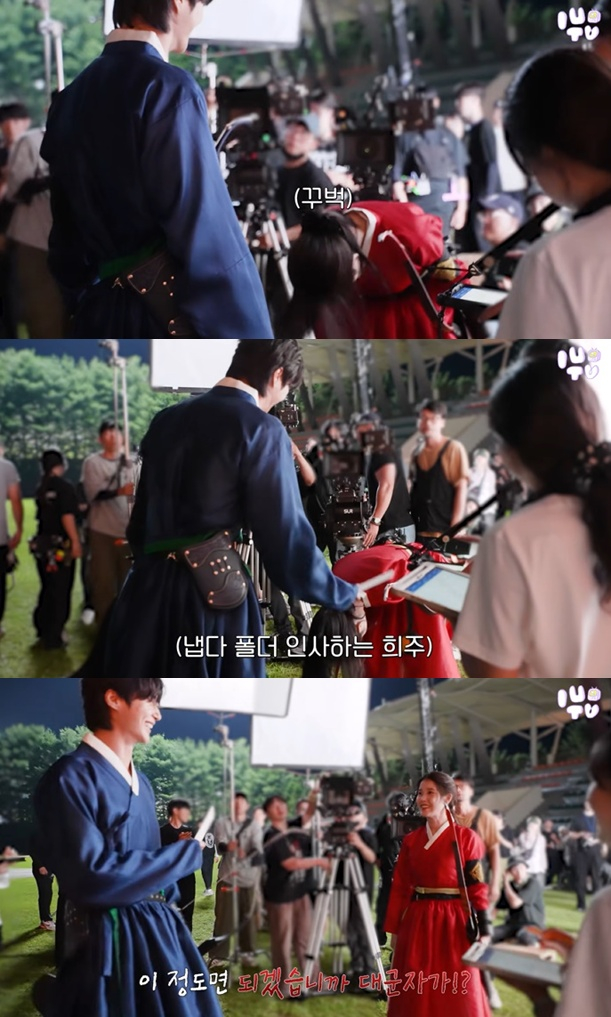 아이유는 궁극장에 몰래 활 연습을 하러 온 희주의 연기를 선보였다. 이안 역의 변우석과 마주한 아이유는 그에게 화를 내며 인사하는 장면이었다. 변우석이 "나 같으면 좀 더 숙였을 거 같아"라고 농담하자 아이유는 90도 이상의 '폴더 인사'를 하며 "이 정도면 되겠습니까 대군자가?'라고 해 웃음을 자아냈다.