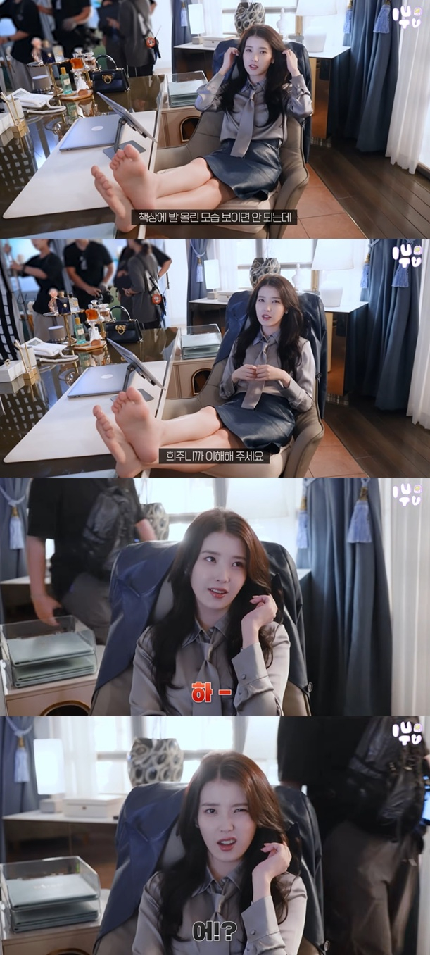 이후 아이유는 책상에 225mm인 맨발을 올리고 앉아 희주의 연기를 펼쳤다. 그는 "죄송합니다. 아이유 티비에서 책상에 발 올린 모습을 보이면 안 되는데 희주니까 이해해 주세요"라고 너스레를 떨었다.
