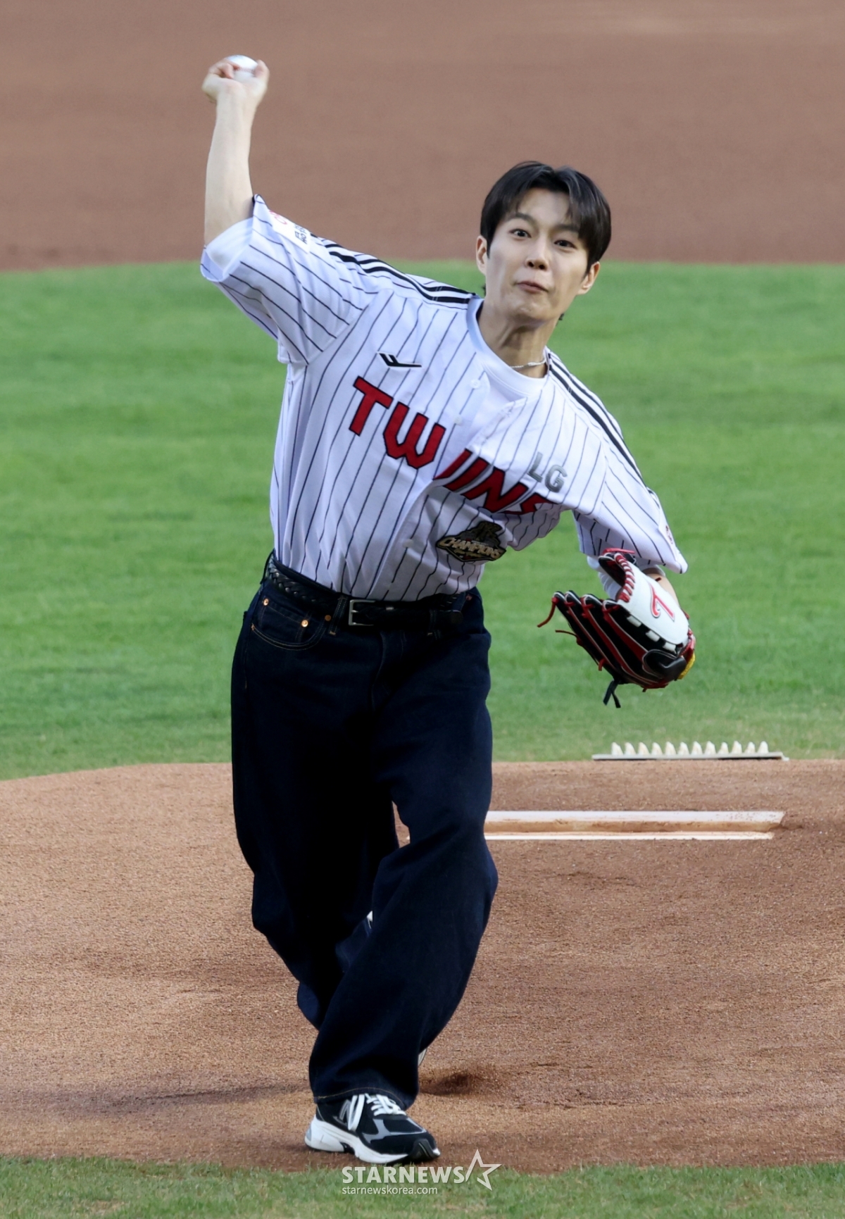 배우 겸 하이라이트(HIGHLIGHT) 멤버 윤두준이 LG 승리기원 시구를 하고 있다.