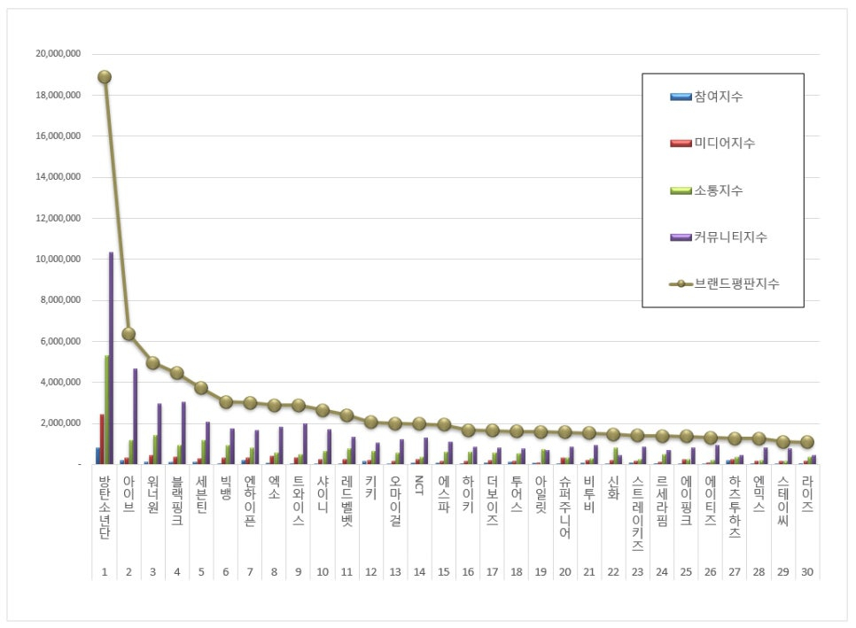 2026년 4월 아이돌그룹 브랜드평판 30위 순위는 방탄소년단, 아이브, 워너원, 블랙핑크, 세븐틴, 빅뱅, 엔하이픈, 엑소, 트와이스, 샤이니, 레드벨벳, 키키, 오마이걸, NCT, 에스파, 하이키, 더보이즈, 투어스, 아일릿, 슈퍼주니어, 비투비, 신화, 스트레이키즈, 르세라핌, 에이핑크, 에이티즈, 하츠투하츠, 엔믹스, 스테이씨, 라이즈 순으로 분석됐다.