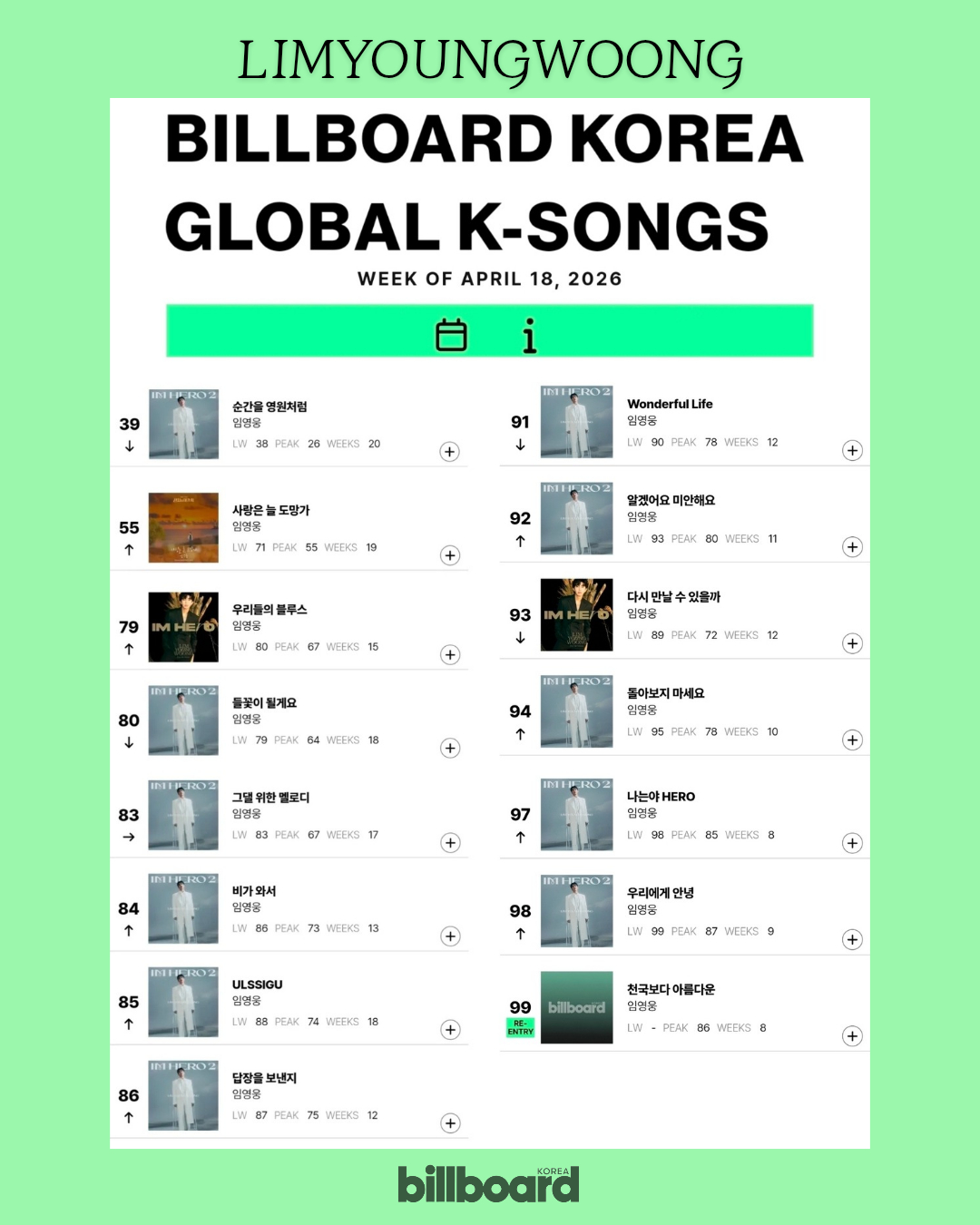 4월 3주 차 빌보드 코리아 발표에 따르면, 임영웅은 메인 차트 중 하나인 'Billboard Korea Global K-Songs' 톱100에 15곡을 진입시켰다.