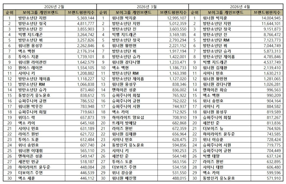 2026년 4월 보이그룹 개인 브랜드평판 30위 순위는 워너원 박지훈, 방탄소년단 지민, 방탄소년단 정국, 방탄소년단 진, 방탄소년단 RM, 방탄소년단 뷔, 방탄소년단 슈가, 방탄소년단 제이홉, 빅뱅 지드래곤, 워너원 김재환, 샤이니 민호, 워너원 황민현, 워너원 강다니엘, 엔하이픈 희승, 엑소 백현, 위너 송민호, 샤이니 키, 워너원 옹성우, 슈퍼주니어 희철, 세븐틴 준, 더보이즈 뉴, 하이라이트 윤두준, 위너 이승훈, 슈퍼주니어 시원, 슈퍼주니어 규현, 빅뱅 태양, 라이즈 원빈, 샤이니 태민, 엑소 카이, 동방신기 유노윤호 순으로 분석됐다.