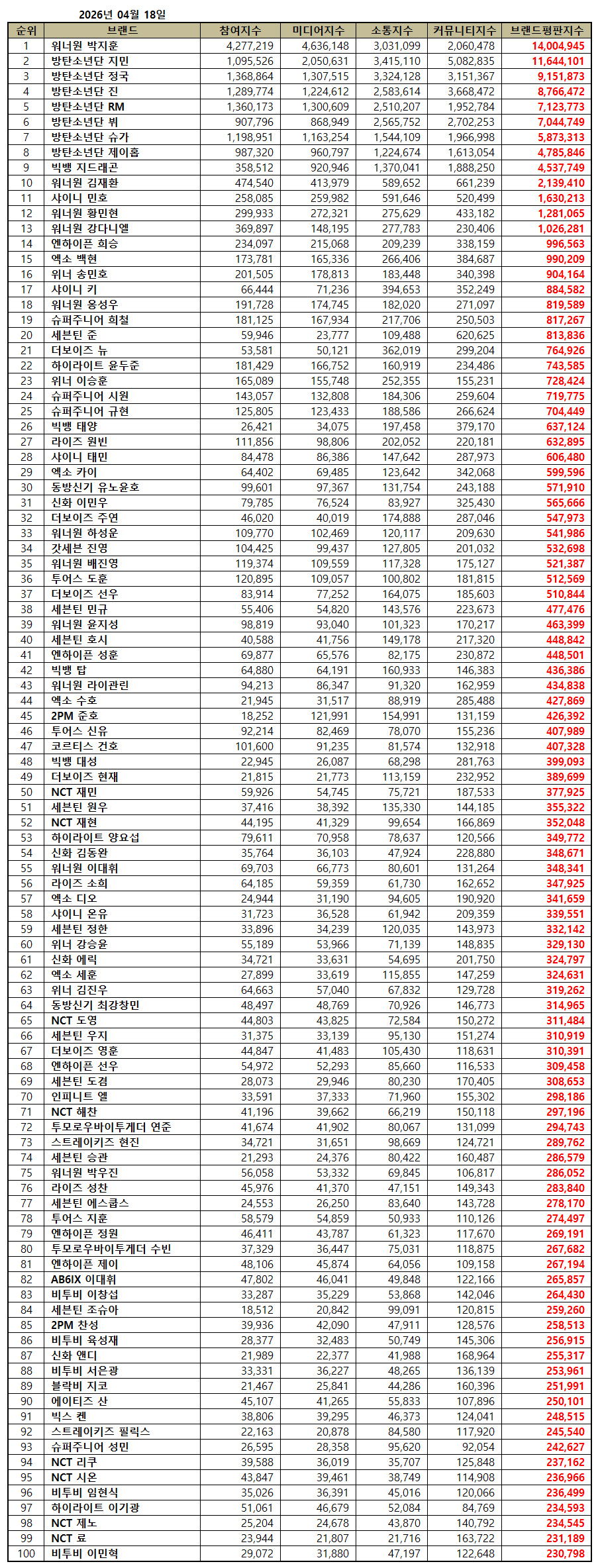 2026년 4월 보이그룹 개인 브랜드평판 100위 브랜드는 워너원 박지훈, 방탄소년단 지민, 방탄소년단 정국, 방탄소년단 진, 방탄소년단 RM, 방탄소년단 뷔, 방탄소년단 슈가, 방탄소년단 제이홉, 빅뱅 지드래곤, 워너원 김재환, 샤이니 민호, 워너원 황민현, 워너원 강다니엘, 엔하이픈 희승, 엑소 백현, 위너 송민호, 샤이니 키, 워너원 옹성우, 슈퍼주니어 희철, 세븐틴 준, 더보이즈 뉴, 하이라이트 윤두준, 위너 이승훈, 슈퍼주니어 시원, 슈퍼주니어 규현, 빅뱅 태양, 라이즈 원빈, 샤이니 태민, 엑소 카이, 동방신기 유노윤호, 신화 이민우, 더보이즈 주연, 워너원 하성운, 갓세븐 진영, 워너원 배진영, 투어스 도훈, 더보이즈 선우, 세븐틴 민규, 워너원 윤지성, 세븐틴 호시, 엔하이픈 성훈, 빅뱅 탑, 워너원 라이관린, 엑소 수호, 2PM 준호, 투어스 신유, 코르티스 건호 , 빅뱅 대성, 더보이즈 현재, NCT 재민, 세븐틴 원우, NCT 재현, 하이라이트 양요섭, 신화 김동완, 워너원 이대휘, 라이즈 소희, 엑소 디오, 샤이니 온유, 세븐틴 정한, 위너 강승윤, 신화 에릭, 엑소 세훈, 위너 김진우, 동방신기 최강창민, NCT 도영, 세븐틴 우지, 더보이즈 영훈, 엔하이픈 선우, 세븐틴 도겸, 인피니트 엘, NCT 해찬, 투모로우바이투게더 연준, 스트레이키즈 현진, 세븐틴 승관, 워너원 박우진, 라이즈 성찬, 세븐틴 에스쿱스, 투어스 지훈, 엔하이픈 정원, 투모로우바이투게더 수빈, 엔하이픈 제이, AB6IX 이대휘, 비투비 이창섭, 세븐틴 조슈아, 2PM 찬성, 비투비 육성재, 신화 앤디, 비투비 서은광, 블락비 지코, 에이티즈 산, 빅스 켄, 스트레이키즈 필릭스, 슈퍼주니어 성민, NCT 리쿠, NCT 시온, 비투비 임현식, 하이라이트 이기광, NCT 제노, NCT 료, 비투비 이민혁이다.