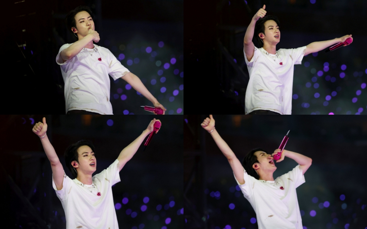 진은 'Into the Sun'의 고음 파트에서 혼자 레일에서 내려 차례대로 돌아가는 멤버들과 손뼉을 부딪치기도 하며 관객들에게 더욱 큰 즐거움을 선사했다. 또 멤버와 서로 유쾌하게 마이크를 들어주며 비현실적일 정도로 완벽한 라이브를 펼치는 등 더욱 풍성한 공연을 연출했다. 진이 관객들에게 보낸 설레는 엄지 키스 또한 화제가 됐다.