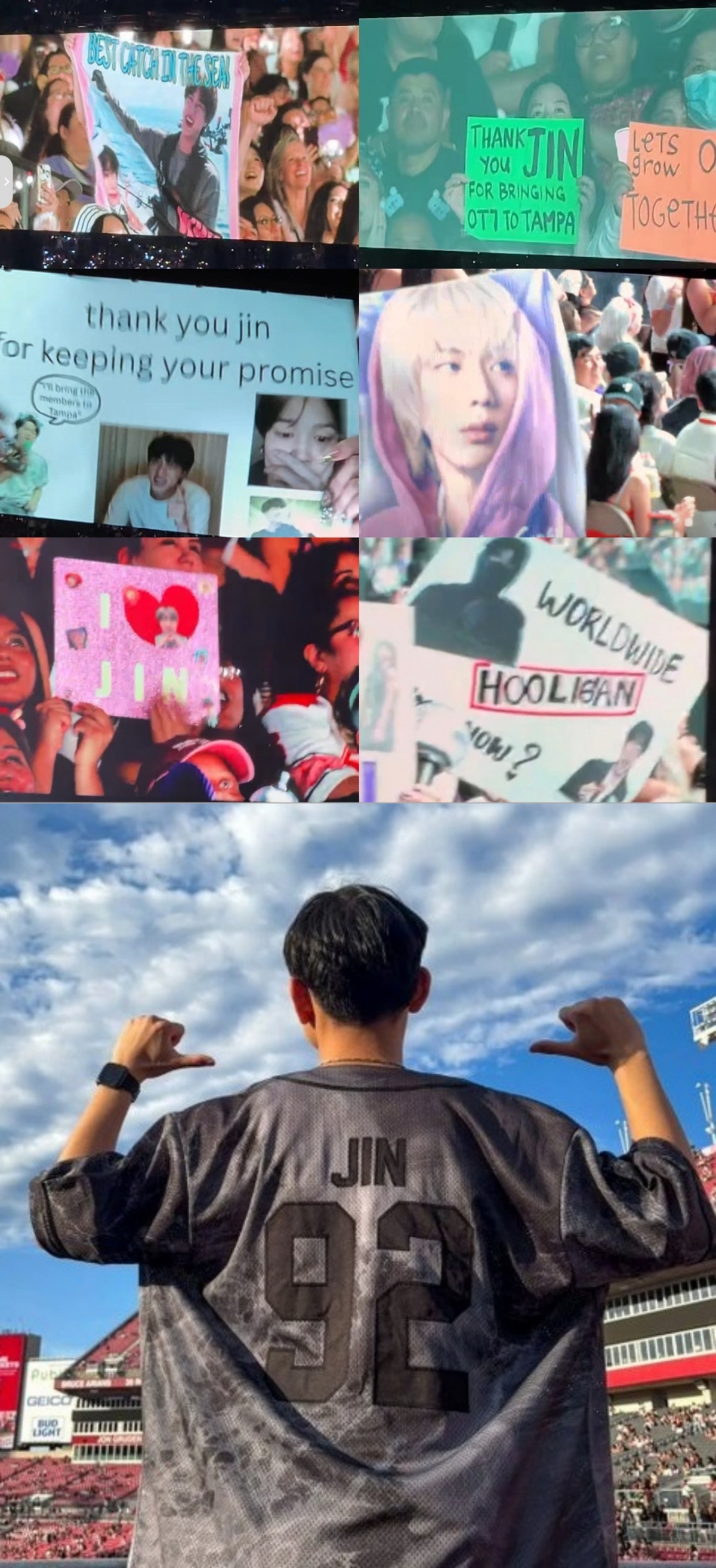 지난해 진은 자신의 첫 솔로 투어인 #RUNSEOKJIN_EP.TOUR(달려라 석진 투어)로 방탄소년단 멤버 중 최초로 탬파에서 콘서트를 펼쳤다. 진은 탬파의 열정적인 최고의 응원과 분위기에 멤버들과 함께 투어로 탬파를 꼭 다시 찾겠다고 약속했다. 진으로 인해 탬파의 첫 방탄소년단 콘서트가 이뤄진 것. 탬파 팬들은 진이 꼭 다시 돌아오겠다는 지난해의 약속을 지켰다며 우레 같은 함성과 뜨거운 응원으로 진을 향한 행복한 팬심과 고마움을 표현했다. 진의 굿즈 티셔츠 또한 빠르게 품절되며 열광적인 인기를 실감케 했다.