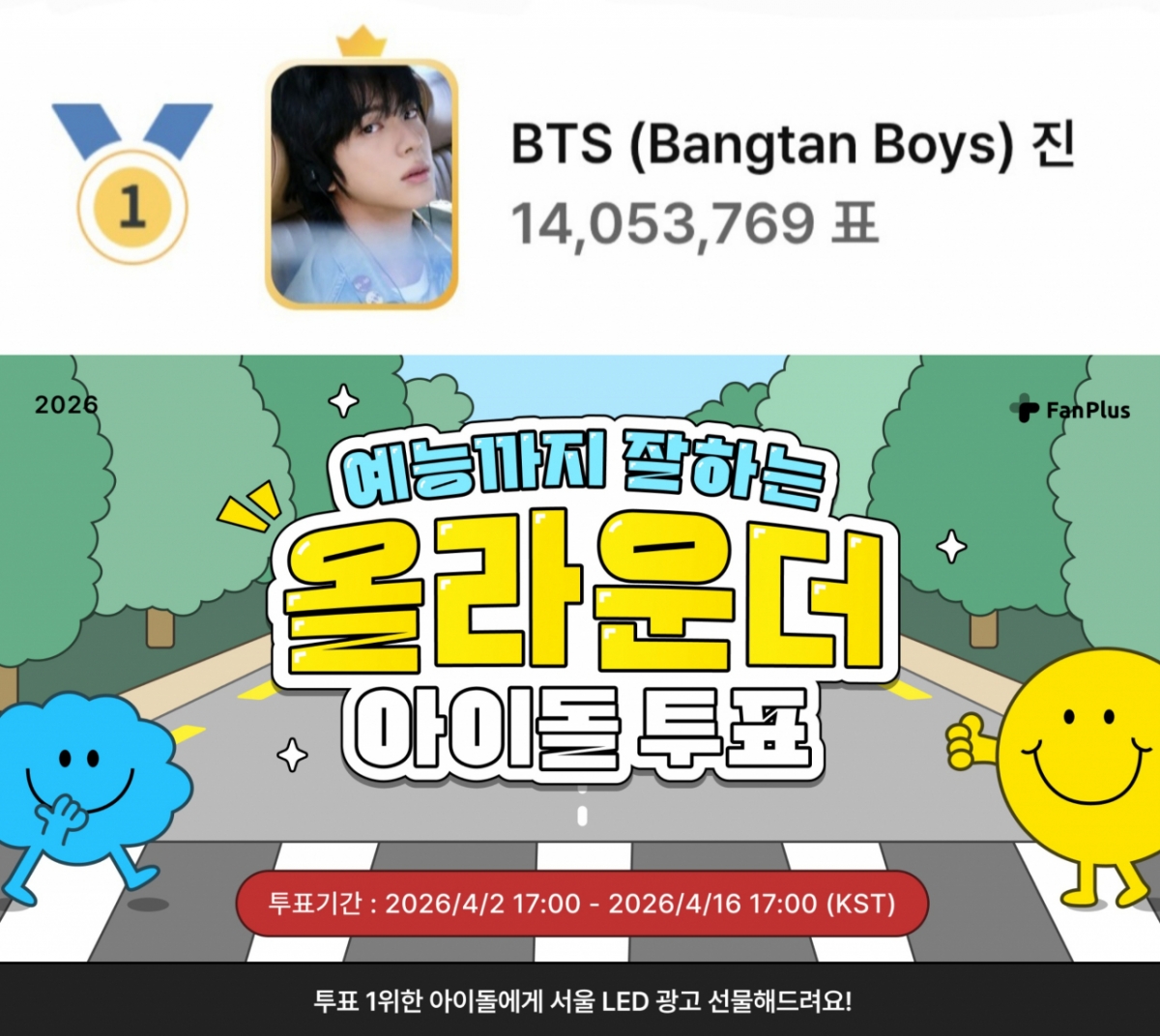 진은 팬 커뮤니티 플랫폼 팬플러스(FanPlus)에서 진행한 2026 KPOP '예능까지 잘하는 올라운더 아이돌'투표에서 압도적인 득표로 1위에 올랐다.