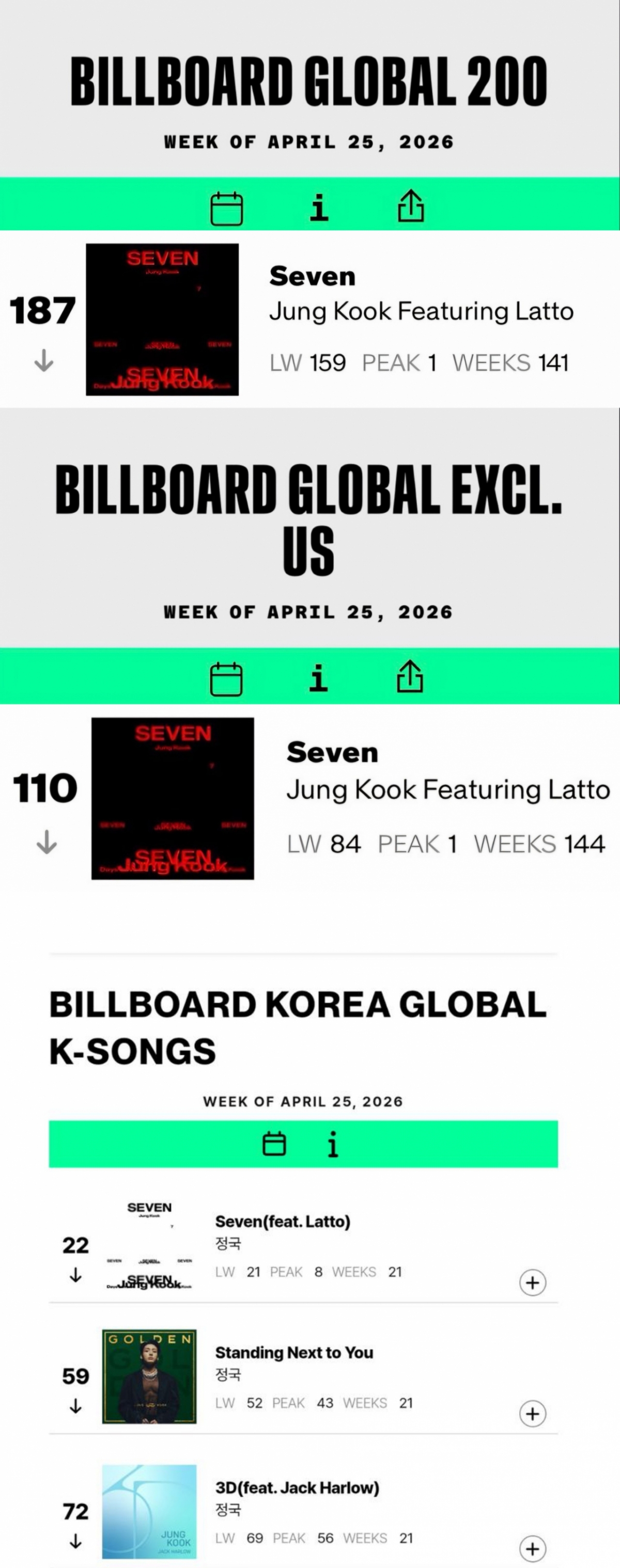 앞서 정국은 'Seven', 'Standing Next to You', '3D'로 '글로벌 200'과 '글로벌(미국 제외)' 차트에서 모두 1위를 차지했다. 그는 '글로벌 200'과 '글로벌(미국 제외)' 차트에 각각 17곡과 18곡을 차트인시켰고, 통산 276주와 327주 동안 머물렀다.