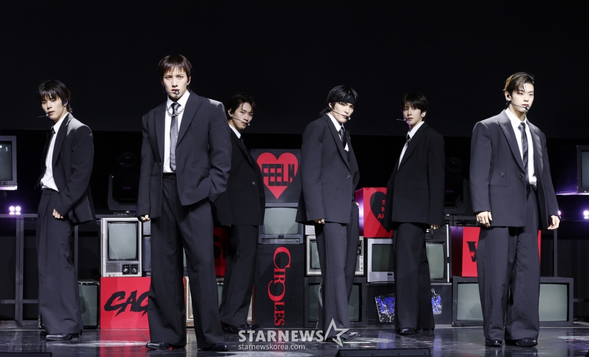 그룹 82메이저가 28일 서울 서대문구 예스24 원더로크홀에서 진행된 다섯번 째 미니앨범 'FEELM' 발매 기념 쇼케이스에서 멋진 무대를 선보이고 있다. /2026.04.28