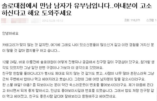 지난 26일 한 온라인 커뮤니티 게시판에는 "솔로대첩에서 만남 남자가 유부남입니다. 아내분이 고소하신다고 해요. 도와주세요"라는 제목의 글이 게재돼 네티즌들의 눈길을 사로잡았다.