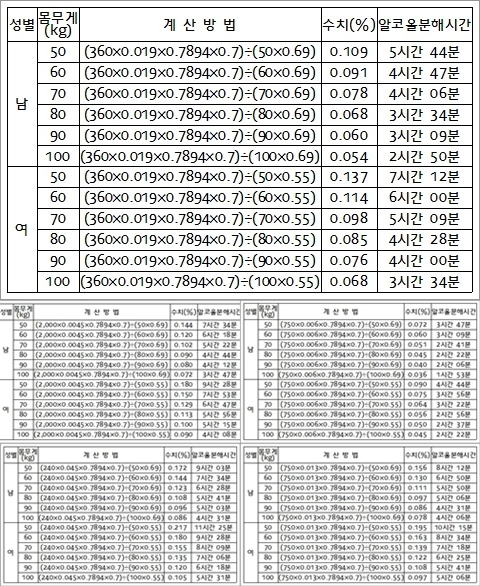 위의 표는 각 참이슬 1병과 생맥주 2,000cc·막걸리 1병·양주 4잔·와인 1병을 마셨을 경우, 성인 남녀의 체중에 따른 혈중 알코올을 분해하는데 걸리는 시간이다. 이때, 기본적인 계산법은 [(섭취한 술의 양x알코올 농도x알코올 비중)÷(체중x남여성별계수)] 공식에 따른다.