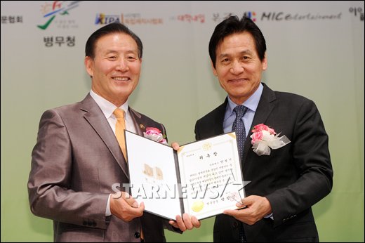 배우 안성기(오른쪽)가 21일 오전 서울 중구 태평로1가 한국프레스센터에서 열린 '2013 공정병역 협약식'에서 박창명 병무청장에게 홍보대사 위촉장을 받은 후 포즈를 취하고 있다.