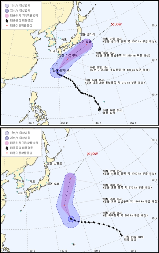 두 개의 태풍이 한꺼번에 일본으로 북상하고 있다.