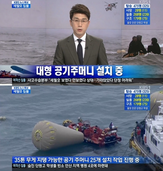 18일 오후 KBS 1TV 뉴스특보에 따르면 해군은 이날 오후 세월호 선체가 추가로 가라앉는 것을 방지하기 위해 공기 주머니를 설치하고 있다.