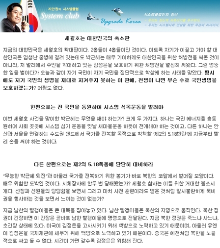이어 그는 박 대통령이 이번 세월호 사건을 맞아 "국민 에너지를 총동원하여 사회 곳곳에 시스템 심기 운동을 옛날 새마을운동 하듯이 전개해야 한다"면서 "안산과 서울을 연결하는 수도권 밴드에서 국가를 전복할 목적으로 획책할 제 2의 5·18 반란에 지금부터 손을 써야 한다"고 목소리를 높였다.