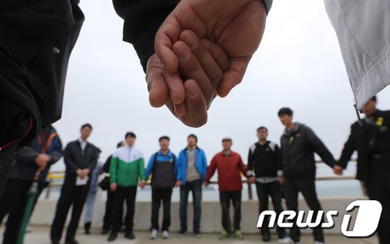 세월호 여객선 침몰 사고 14일째인 29일 전남 진도 팽목항에서 기독교단체 회원들이 실종자의 무사귀환을 기원하며 기도를 하고 있다./사진=뉴스1