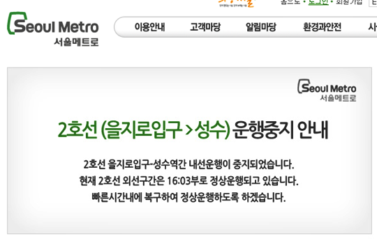 이에 대해 서울메트로 공식 홈페이지는 "2호선 을지로입구-성수역 간 내선운행이 중지됐다. 현재 2호선 외선구간은 오후 4시 3분부로 정상 운행되고 있다. 빠른 시간 내에 복구해 정상 운행하도록 하겠다"고 밝혔다.