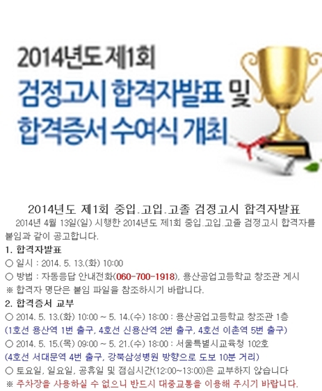 2014년도 검정고시 합격자 발표가 공고됐다.
