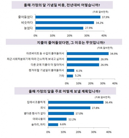 아르바이트 전문포털 알바천국(www.alba.co.kr)이 전국 10대에서 50대까지 남녀 863명을 대상으로 전년 대비 가정의 달 선물 비용 등 지출 수준에 대해 조사한 결과, 72.1%가 전년과 비슷하거나 더 줄었다고 생각하는 것으로 나타났다.