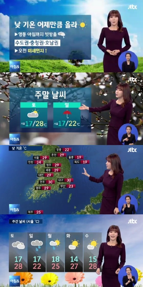 일요일 오후부터 전국에 비가 내리면서 낮 기온도 다소 떨어질 전망이다. 25일 기온분포도는 서울 17~22도, 대구 19~25도, 부산 18~22도, 제주 19~25도, 청주 18~25도, 광주 18~23, 강릉 19~24도, 전주 19~25, 울릉/독도 19~24도다.
