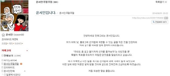 논란이 불거지자 윤서인 씨는 해당 글을 삭제한 뒤 1일 오후 "제가 어제 낮, 블로그에 선거법에 위반될 수 있는 글을 적은 것을 인정하며 저의 실수를 여러분 앞에 겸허히 사과드립니다"라는 내용의 사과 글을 게재했다.