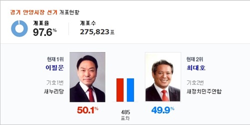 5일 오전 10시 현재 안양 개표율은 97.6%이고, 개표수는 27만 5823표다. 새누리당의 이필운 후보가 13만 6586표-50.1%의 득표율로 1위를 달리고 있지만, 새정치민주연합 최대호 후보가 13만 6101표-49.9%의 득표율로 초박빙 승부를 펼치고 있다. 양 후보의 표차는 단 485표에 불과하다. 남은 결과에 따라 뒤집힐 가능성도 배제할 수 없다.