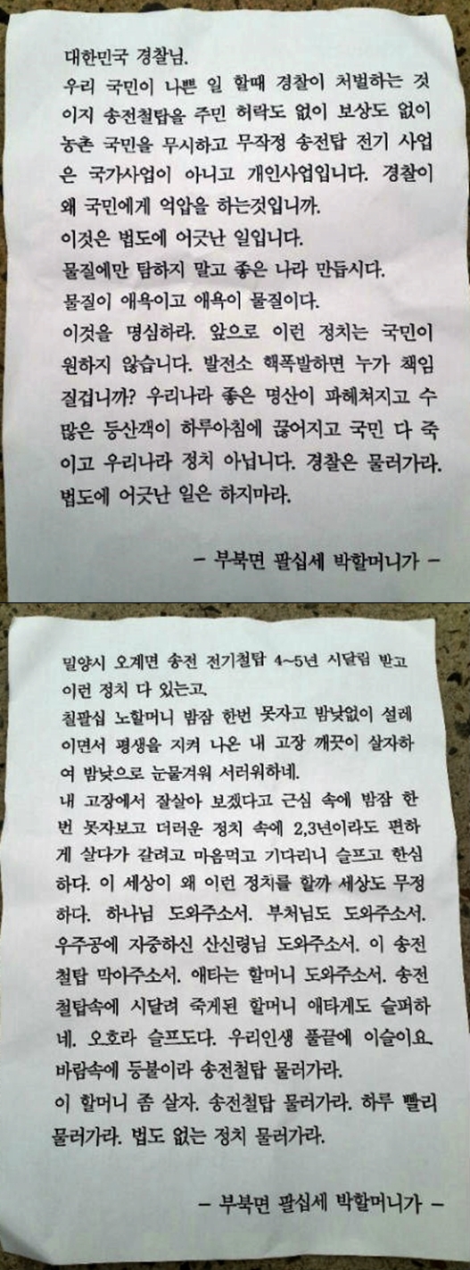 밀양의 할머니들은 이런 내용이 담긴 편지를 강제 철거를 위해 출동한 경찰들에게 나눠준 것으로 전해졌다.