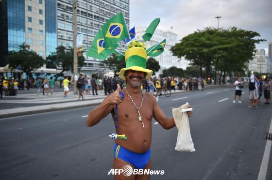 브라질의 한 축구팬이 지난 12일(현지시간) 브라질 리우 데 자네이루 코파카바나 해변에서 열린 피파 팬 페스트( FIFA Fan Fest)에서 독특한 차림으로 응원하고 있다.
