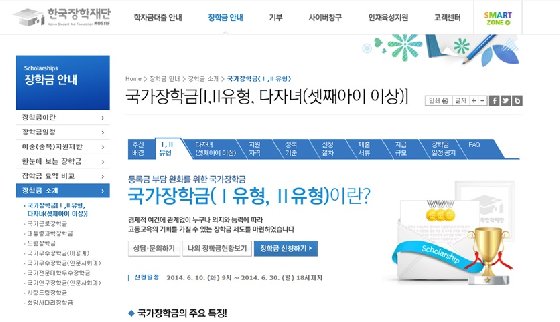 한국 장학재단에서 제공하는 국가 장학금 [I유형, II유형, 다자녀(셋째아이 이상)] 은 2014년 6월 10일 오전 9시부터 2014년 6월 30일까지 오후 6시까지 신청할 수 있다.