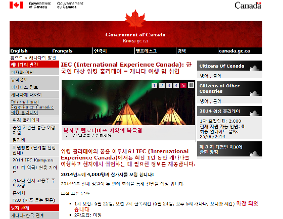 25일 오전 7시부터 주한 캐나다 대사관은 IFC(International Experience Canada), 캐나다 워킹 홀리데이 참가자 신청을 받았다. 그러나 신청자가 폭주하면서 홈페이지가 지연되고 서버가 다운되는 사태가 발생했다.