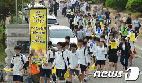 뉴스1에 따르면 16일 단원고 생존학생 43명과 학부모 15명은 전날(15일) 오후 5시 20분쯤 경기도 안산 단원고등학교에서부터 행진을 시작해 이날 오후 3시쯤 여의도 국회의사당에 도착한다.
