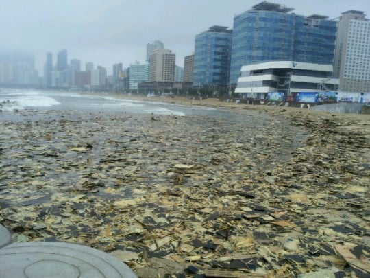 4일 오전 7시 부산 해운대 한 호텔에서 미포 앞까지 해운대 백사장 500m정도의 백사장이 태풍 나크리로 인해 바다 인근에 쌓아뒀던 수십 톤에 달하는 폐목재로 뒤덮인 것으로 알려졌다.