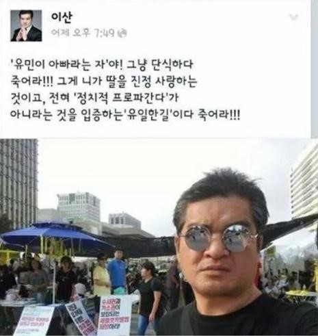 배우 이산은 지난 22일 자신의 SNS에 "유민이 아빠라는 자야, 그냥 단식하다 죽어라. 그게 네가 딸을 진정 사랑하는 것이고, 전혀 '정치적 프로파간다'가 아니라는 것을 입증하는 유일한 길이다. 죽어라"라는 글을 게재했다.