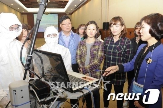 16일 오후 2시30분부터 국제전기통신연합(ITU) 전권회의가 열리는 부산 벡스코에서 질병관리본부와 미래창조과학부, 부산시, 국립김해검역소, 소방본부, 부산 16개 보건소 등 80여명 관계자들이 참석한 가운데 에볼라 바이러스를 예방하기 위한 ‘열감지기’ 시험행사 모습. /사진=News1