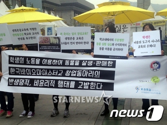 동물보호시민단체 '카라'와 인권교육센터 '들', 전교조 충북지부 등은 지난달 31일 오전 서울 광화문광장에서 기자회견을 열고 "학생의 노동을 이용해 동물을 사육하고 살생, 판매해 온 한국바이오마이스터고(한바고)의 행태를 고발한다"고 밝혔다.