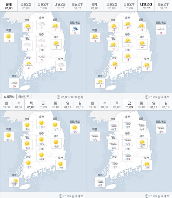 기상청에 따르면 6일은 전날보다 약 10도정도 떨어진 영하 1도로 추위가 시작(서울 기준), 8일 아침 추위가 절정을 보인 뒤 9일부터 누그러질 전망이다.