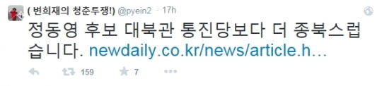 변희재 후보는 3월31일 자신의 SNS 계정에 "정동영 후보 대북관은 통진당보다 더 종북스럽다"는 글을 올렸다.