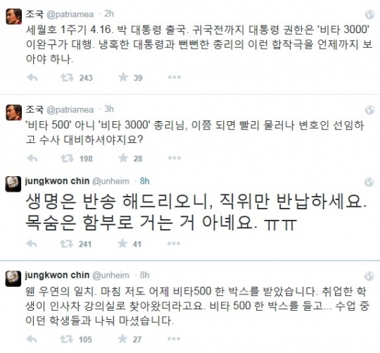 조국 교수는 15일 자신의 SNS 계정을 통해 "'비타500' 아니 '비타3000' 총리님, 이쯤 되면 빨리 물러나 변호인 선임하고 수사 대비하셔야지요?"면서 "세월호 1주기 4.16. 박 대통령 출국. 귀국 전까지 대통령 권한은 '비타3000' 이완구가 대행. 냉혹한 대통령과 뻔뻔한 총리의 이런 합작극을 언제까지 보아야 하나"고 강도 높게 비판했다.