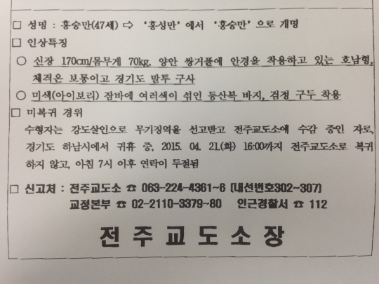 전주교도소는 22일 경찰과 유관기관에 귀휴 미복귀자인 홍승만의 수배전단을 배포했다.