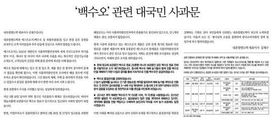내츄럴엔도텍 김재수 대표는 "내츄럴엔도텍과 에스트로지(백수오 등 복합추출물)를 믿고 한결같은 응원을 보내주신 고객 여러분들과 주주 분들께 진심으로 사죄의 말씀을 드립니다"라며 사과문을 시작했다.